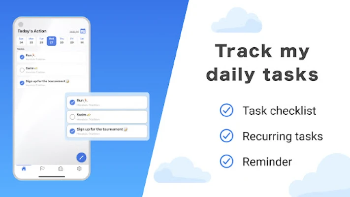 Once you have finished with the settings, you are ready to begin completing your daily tasks and work toward achieving your goals. When you open the app, you will see the tasks you need to do that day. For example, if you set your activity to "Run every Tuesday and Thursday" to achieve your goal of "losing weight by summer," when you open the app on Tuesday or Thursday, a "Run" activity will be generated as a task for that day.
