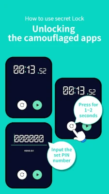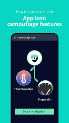- Provides secret lock camouflage. Try using it disguised as a stopwatch app or a fake thermometer app.